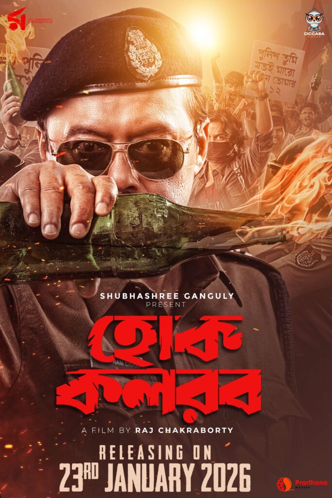 Hok Kolorob (Jan 23, 2026): Directed by Raj Chakraborty, this film is a social drama. The film’s story is inspired by a real-life incident in which a young and bright fresher in a city university hostel is subjected to ragging that allegedly leads to his death. The film shines the light on sensitive contemporary issues and compels us to open individual debates on students’ abuse and accountability. Written and directed by Raj Chakraborty, Hok Kolorob features Saswata Chatterjee in the lead role as Khudiram Chaki. The younger actors in the cast shine with conviction.